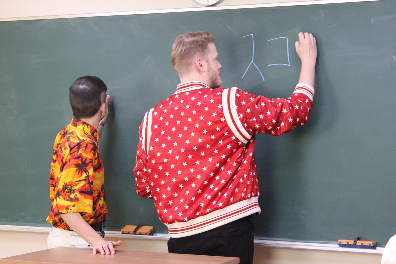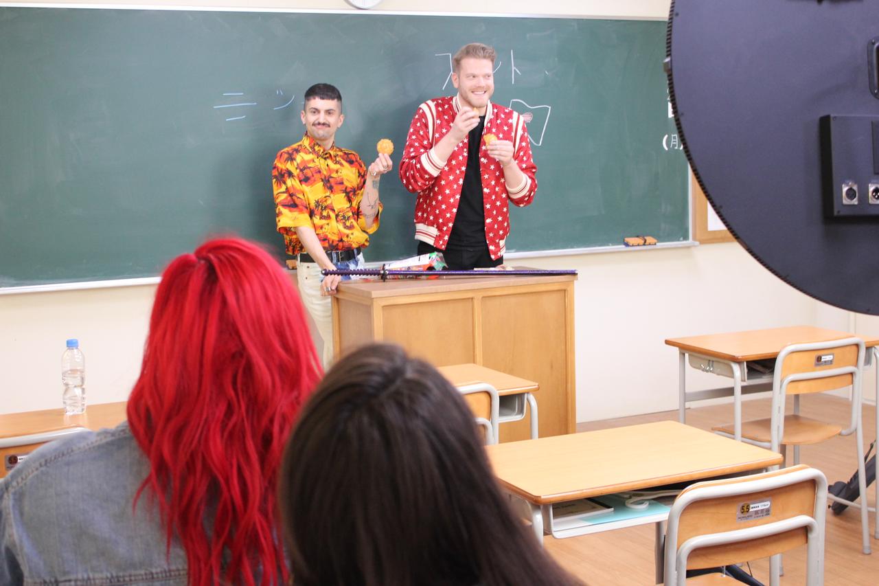 到着後すぐにスタジオセットを確認しに行くと、黒板を見た2人が、日本語で名前を書くお遊びをスタート。「そこの隣に斜め線!」「え、ここ!?」といった言葉のやり取りのみで名前を書く様子は、スタッフに大ウケ。打ち合わせのはずが、本番さながらの大盛り上がりだった。