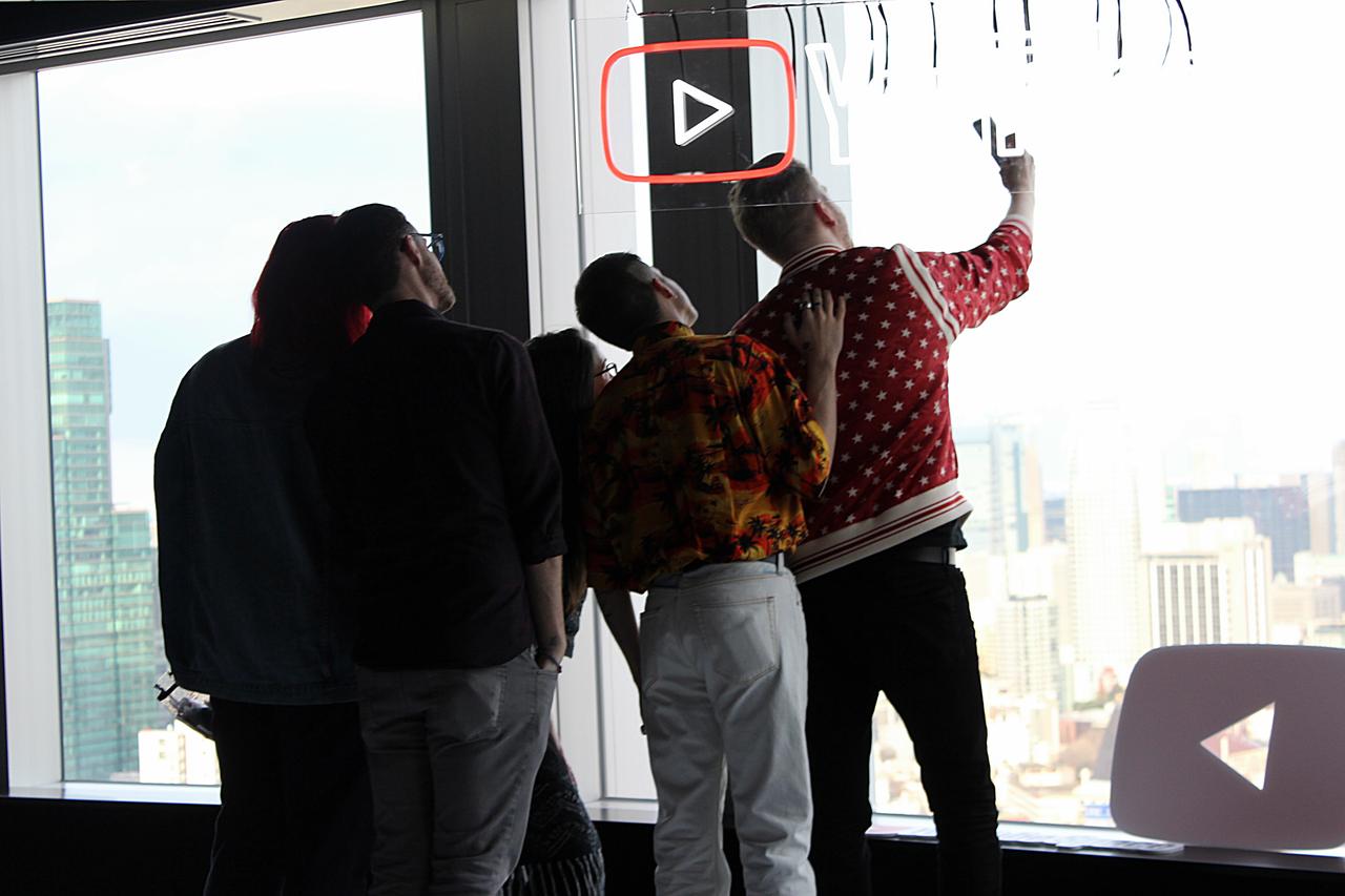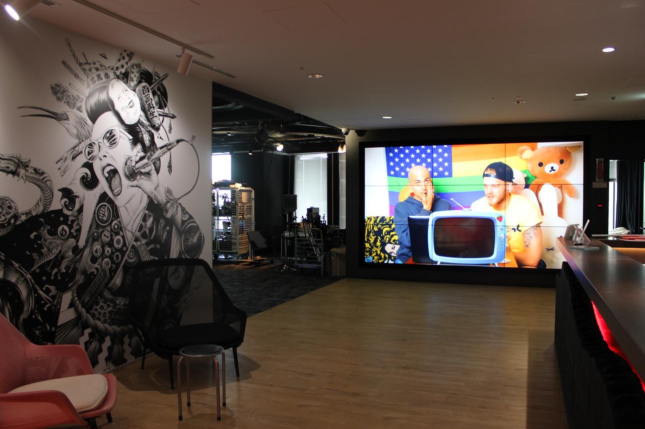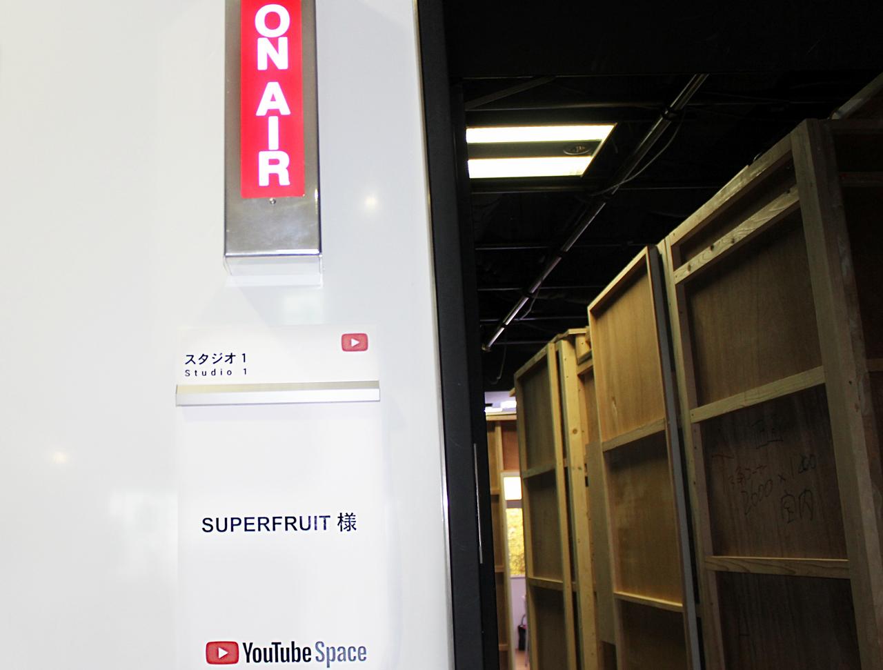 YouTubeスペースの巨大スクリーンには、スーパーフルーツのアーカイブ動画が。©フロントロウ