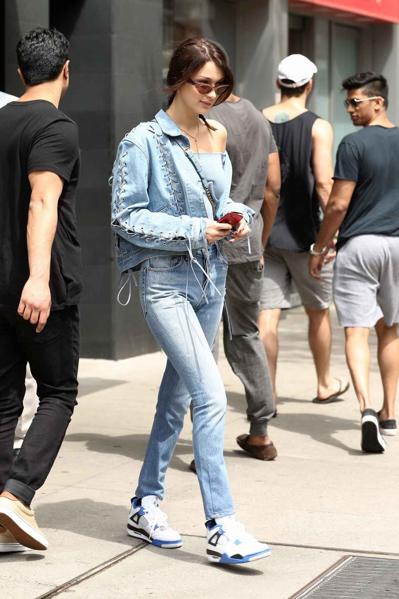 ストリートスタイルが大好きなヘイリーは、adidasのストライプ入りオーバーサイズ×クロップト丈デニムジャケットとスカートのセットアップで。キャットアイサングラスと、Supreme X LOUIS VUITTONのバッグで赤を差し色に。