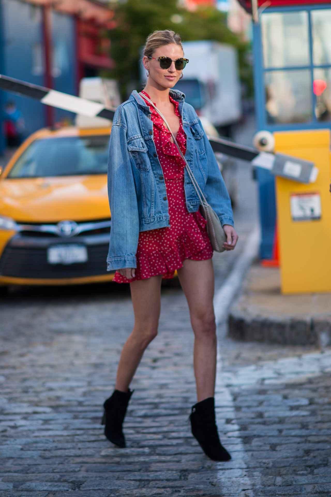 フロントにフリルがデザインされたドット柄の赤いミニワンピースにデニムジャケットを羽織って脱ラブリー。ミドル丈の黒ブーツで足元に重量感をプラスして。