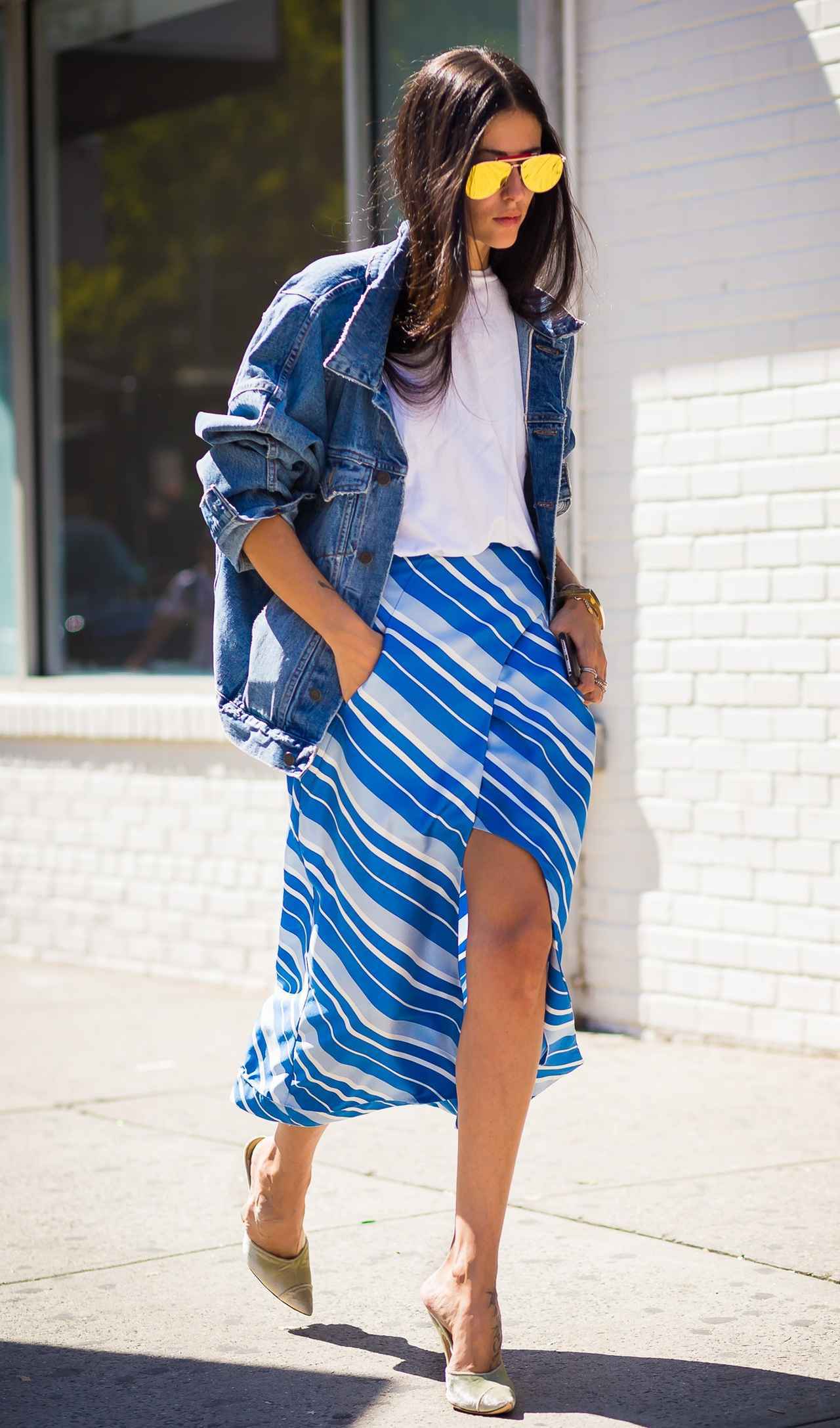 フロントにスリットが入ったストライプ柄のアシンメトリースカートを軸に、白Tシャツとオーバーサイズデニムジャケットで絶妙にカジュアルさをプラスしたギルダ。ミラーサングラスでクールな顔周りに。