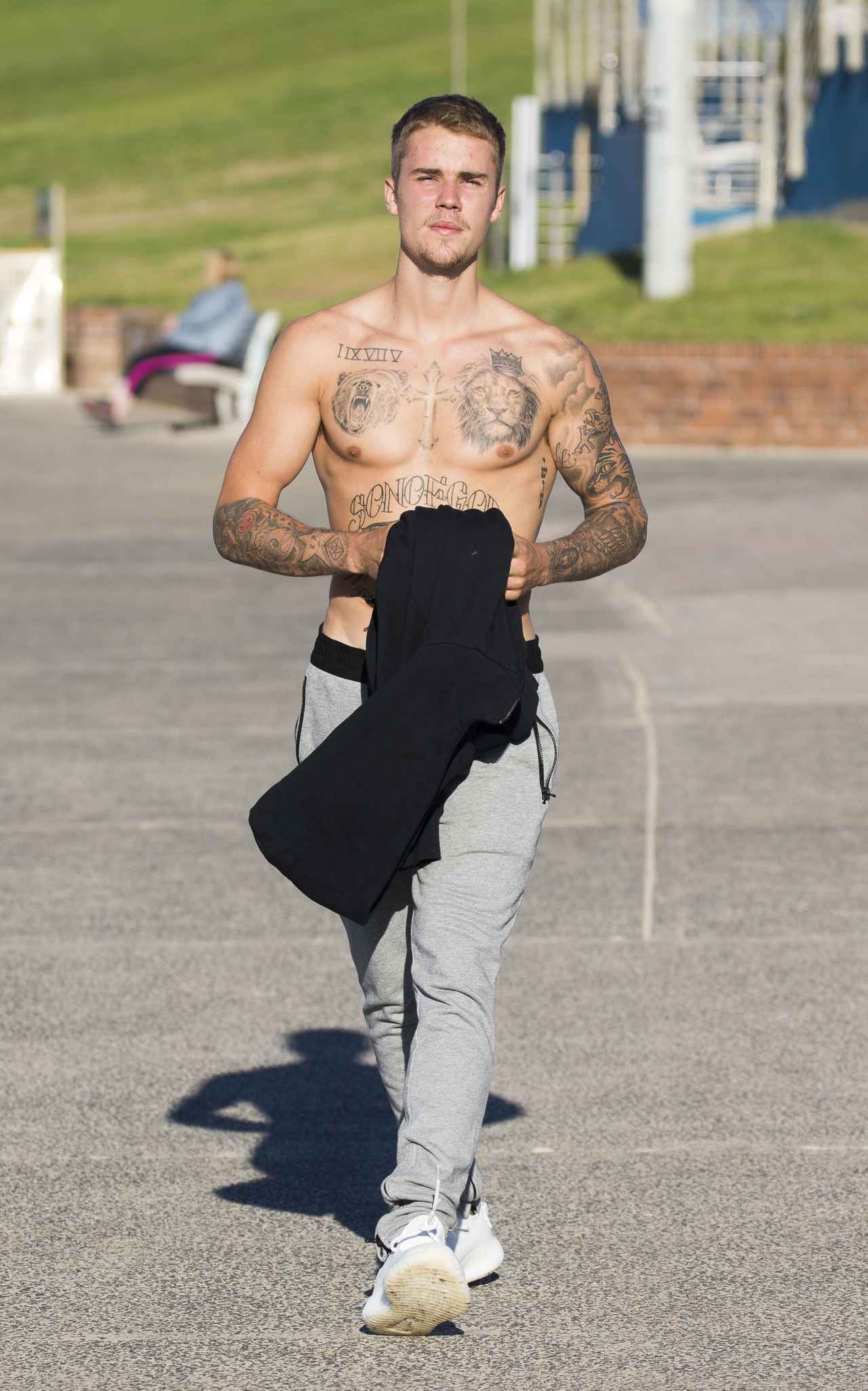 昨年7月に写真を撮られた際のジャスティン。現在の写真と比べると、右肩・右腕&腹部のタトゥーがまだない。