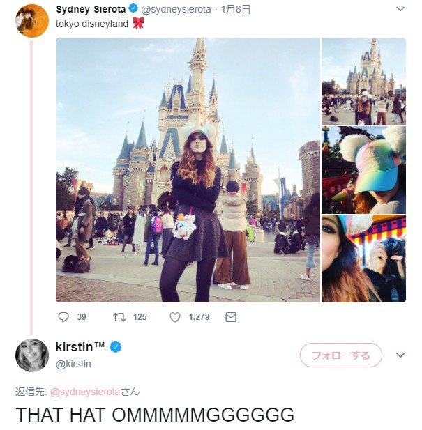 東京ディズニーランドに行った時には、ペンタトニックスのカースティンから「その帽子ヤバイ」とコメントが。シドニーも「でしょ」と返し、親日家セレブ同士で盛り上がっていた。 ©Sydney Sierota/Twitter