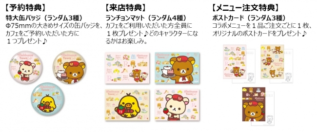 予約をされた方には「オリジナル特大缶バッジ(全3種のうちランダムで1個)」付き、そのほか来店特典は「オリジナルランチョンマット(全4種のうちランダムで1枚)」、またメニューのご注文特典として1品ご注文につき1枚「オリジナルポストカード(全3種のうちランダムで1枚)」がもらえる。