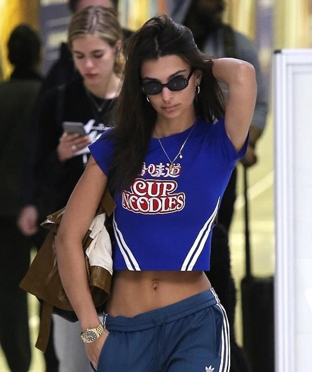 移動のためロサンゼルス国際空港に到着したエミリーが着用していたのは、なんと日本発のインスタント麺「カップヌードル」のロゴが入ったクロップト丈のTシャツ。