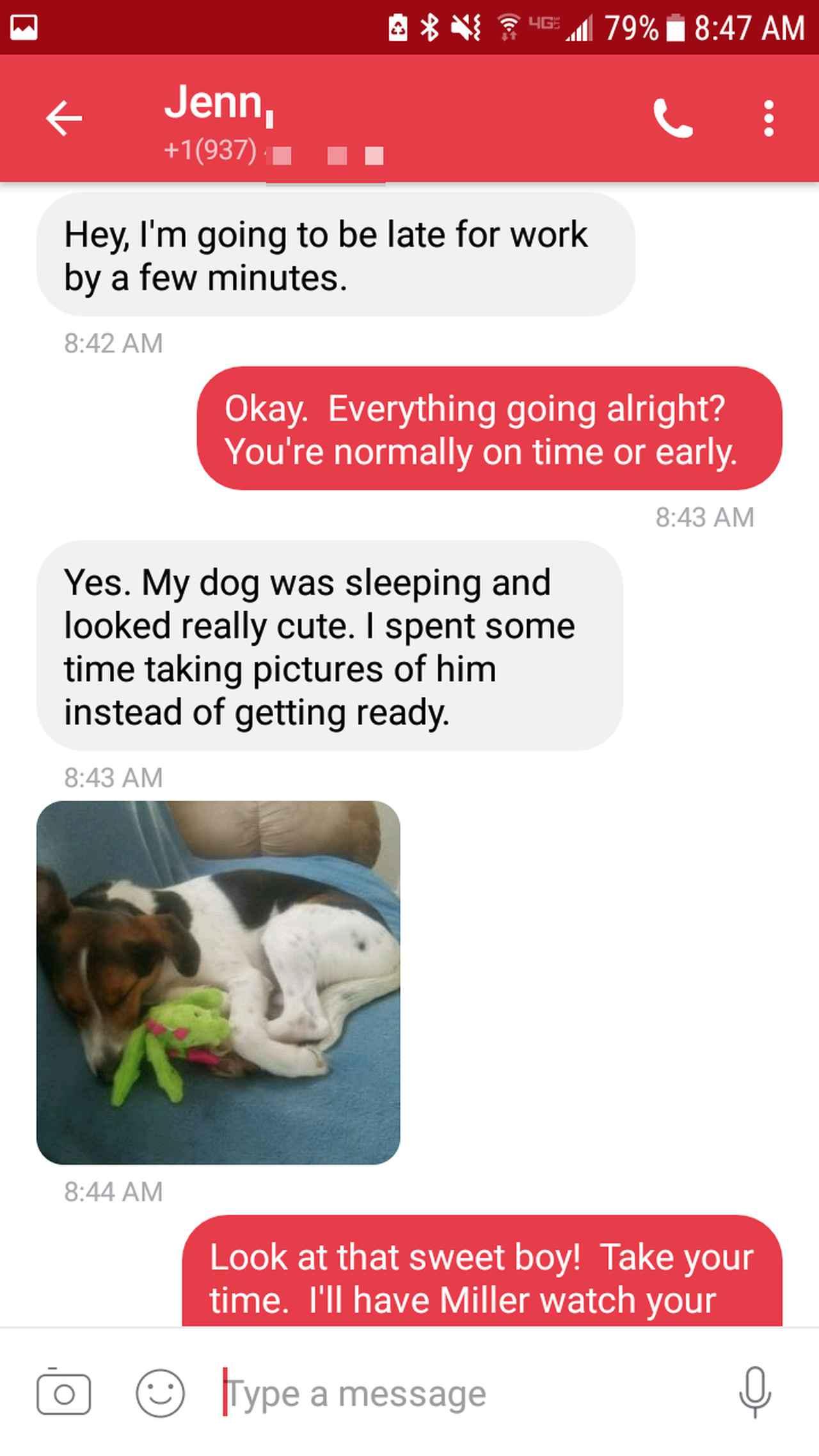 犬が可愛いすぎて遅刻…?ペットを飼っている人ならこの女性の気持ちがわからなくもないと思うが、遅刻の理由にしてはなんとも大人げない。しかし、この女性社員に対するケインの返信もまた目を疑うようなものだった。