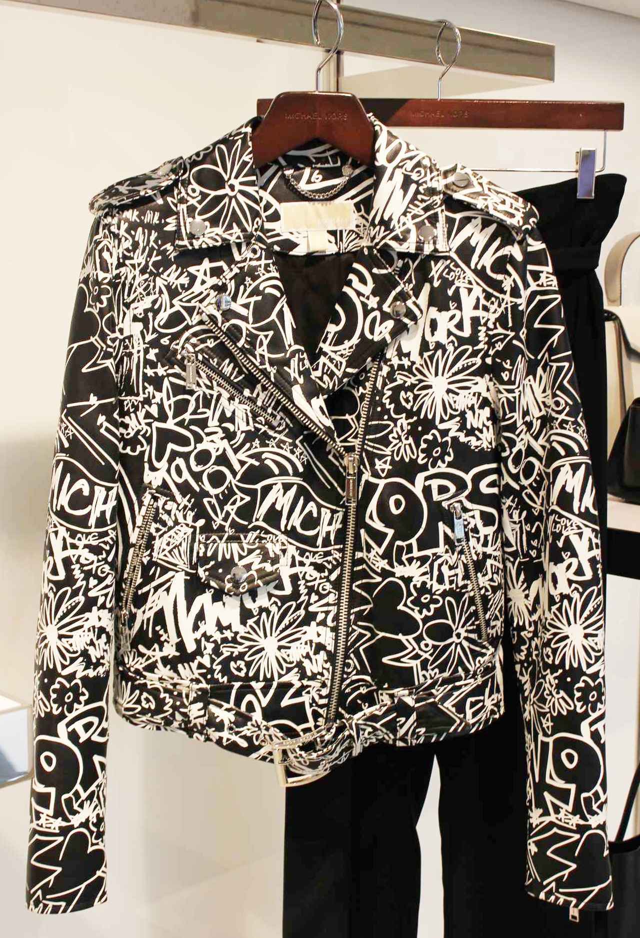 グラフティがプリントされたレザージャケットは、展示会場で話題だった一着!