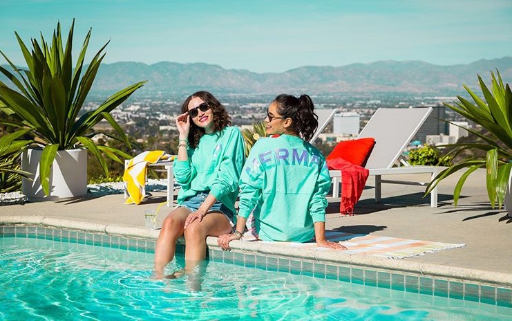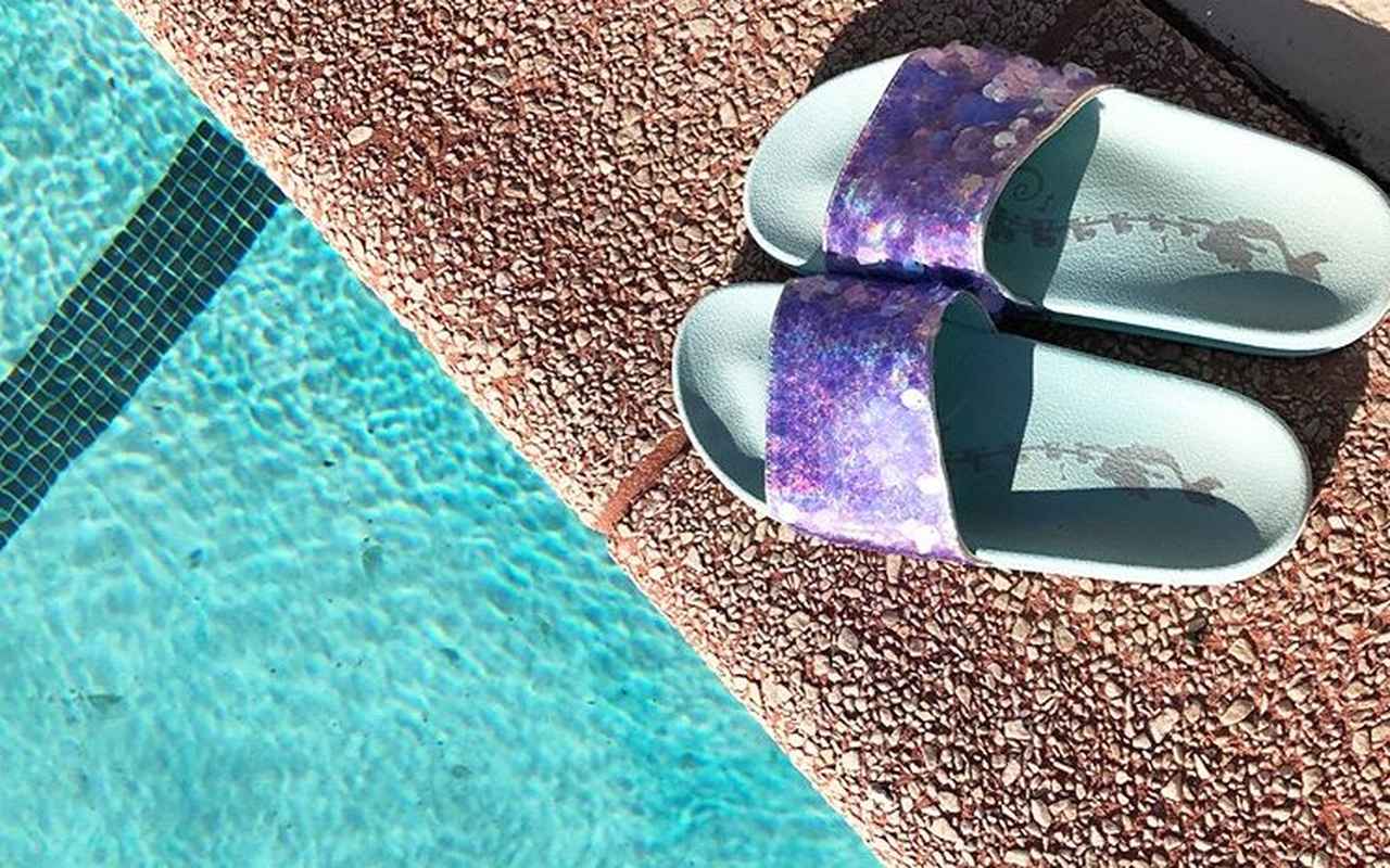 プールサイドでのオシャレにぴったりなアリエルの尾ひれ風ラップタオルや、鱗に見立てたスパンコールがキラキラと輝くサンダル、背中に「MERMAID(マーメイド)」と巨大ロゴの入ったスウェットトップスも。