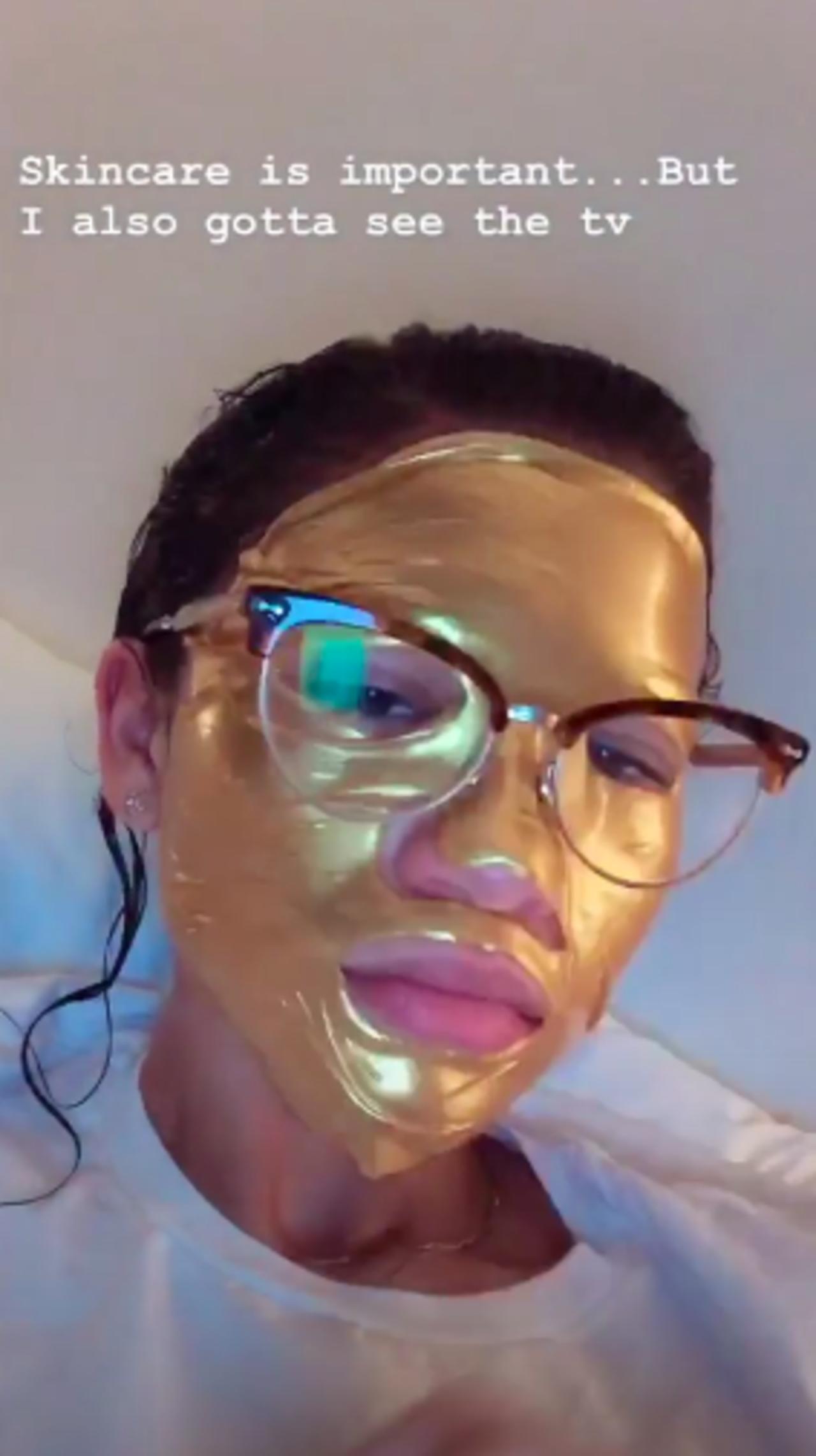 そこにはシャワーを浴びたばかりで髪が濡れているゼンデイヤが、ゴールドのフェイスマスクをしてその上からメガネをかけている姿が。コメントには、「スキンケアは大事だけど、TVも観なきゃいけないのよ」と書き込んだ。