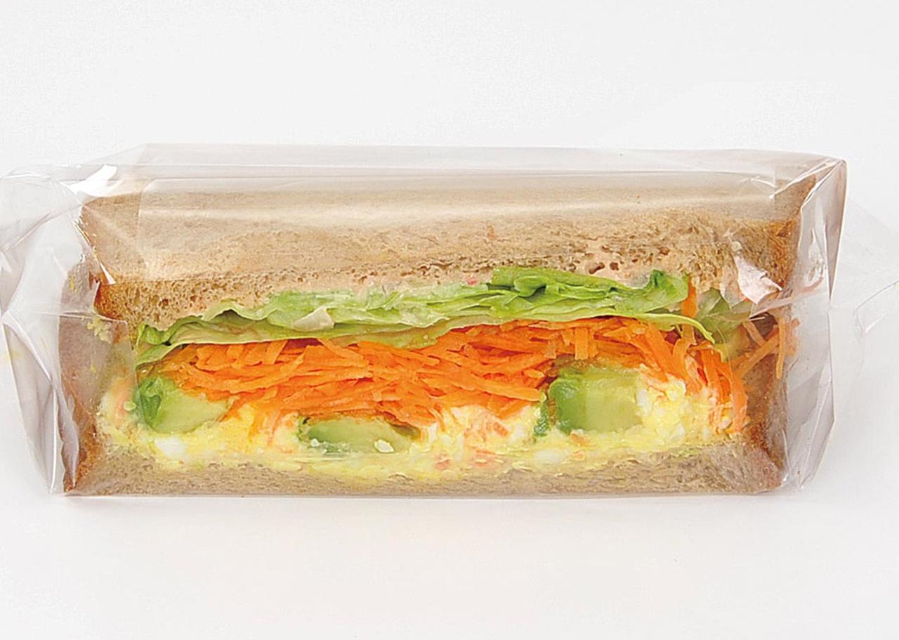 アボカド、人参、レタス、たまごサラダに、オーロラソースを組み合わせ、全粒粉の食パンに挟んだサンドイッチ。