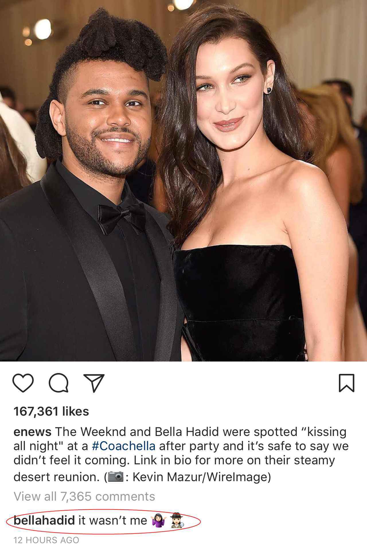 米E!Newsのインスタグラムで、自分とザ・ウィークエンドのキスについての投稿を目にしたベラは「私じゃないわ」というひと言とともに、「あ~あ」といった感じで肩をすくめる女性と探偵の女性の絵文字をつけて反応。なんとまさかの「人違い」であったことを明らかに。