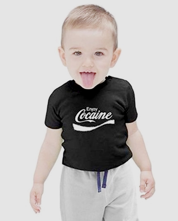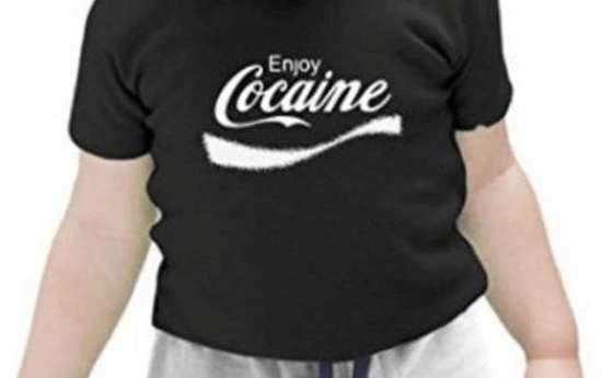 一見飲料メーカー「コカ・コーラ」のマークがデザインされているように見えるこの服。しかし、このTシャツに書かれている文字は「コカ・コーラ」ではなく「コカイン」。さらに上のほうには小さく「エンジョイ」と書かれ、「コカイン」という文字の下には白い粉を思わせるようなラインが引かれており、「コカ・コーラ」Tシャツどころか、「エンジョイ・コカイン」Tシャツだった。