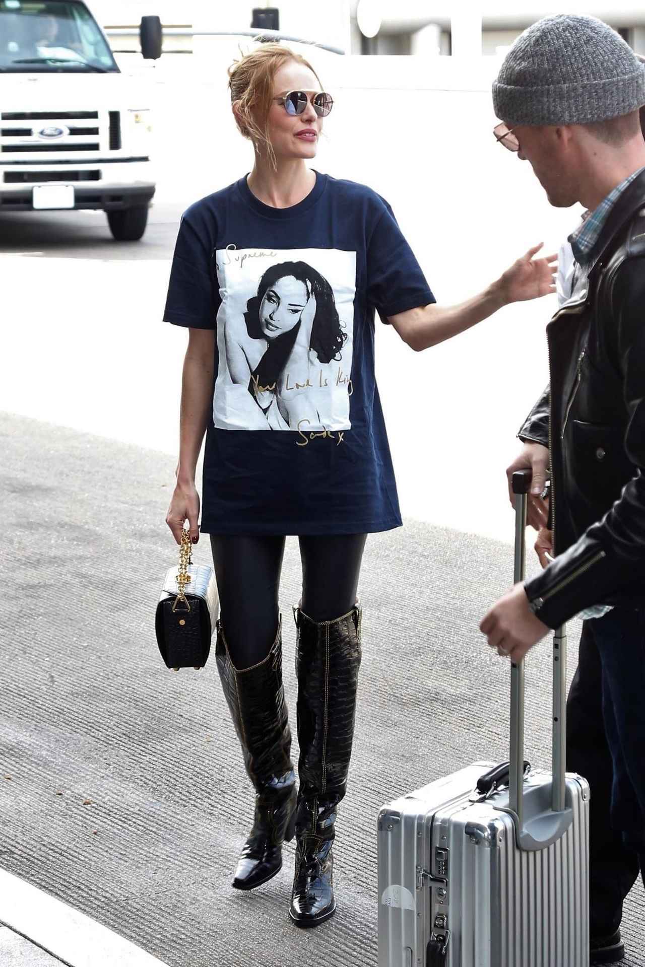 女優のケイトは、シュプリームのTシャツにサイハイブーツを合わせたロックなスタイル。Tシャツには、イギリスのバンド、シャーデー(Sade)のヴォーカリスト、シャーデー・アデュのフェイスプリントが描かれたグラムなTシャツ。