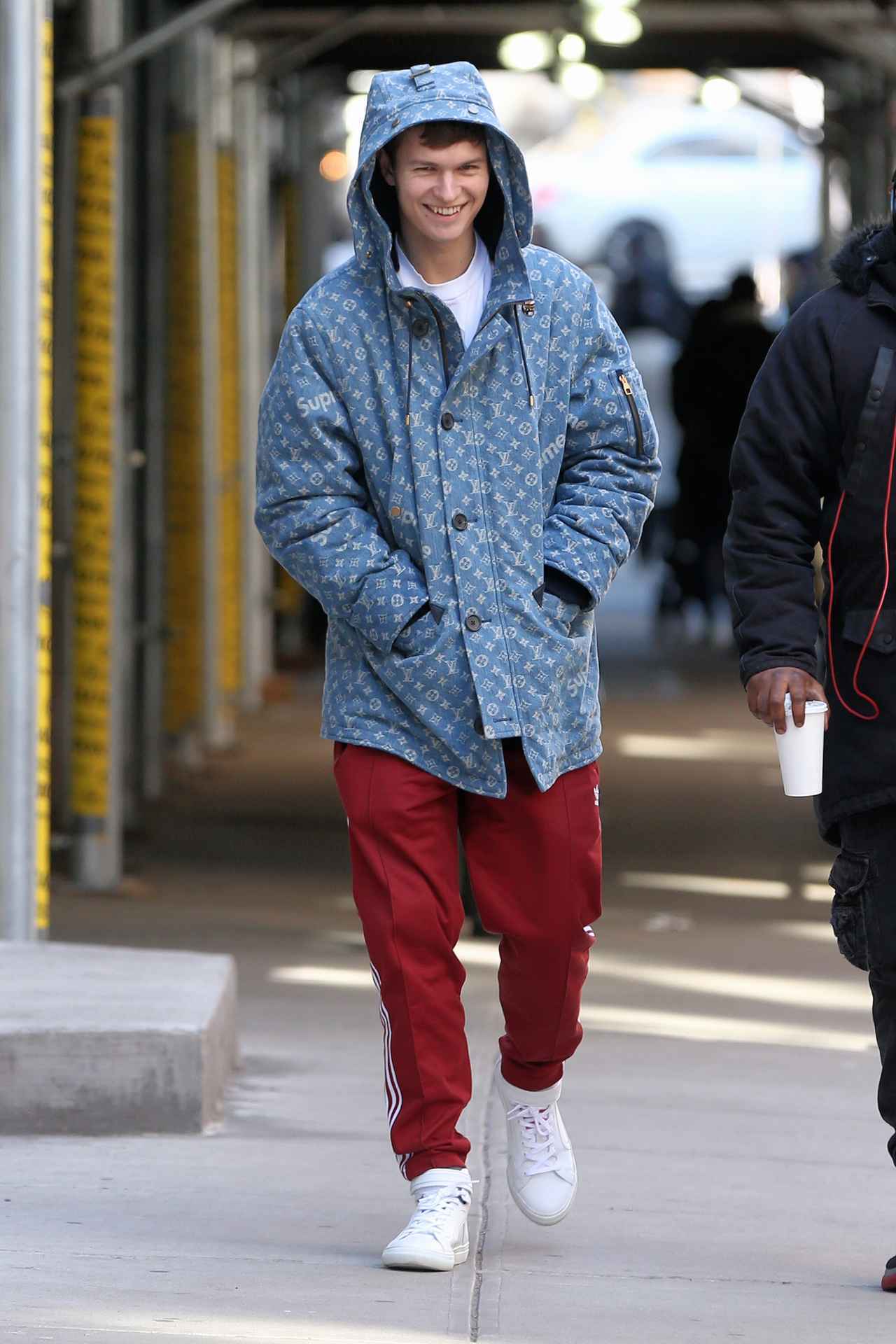ルイ・ヴィトンとシュプリームのコラボラインのデニムジャケットを着用した、映画『ダイバージェント』のイケメン俳優アンセルをニューヨークで発見。エンジ色のトラックパンツと合わせて。