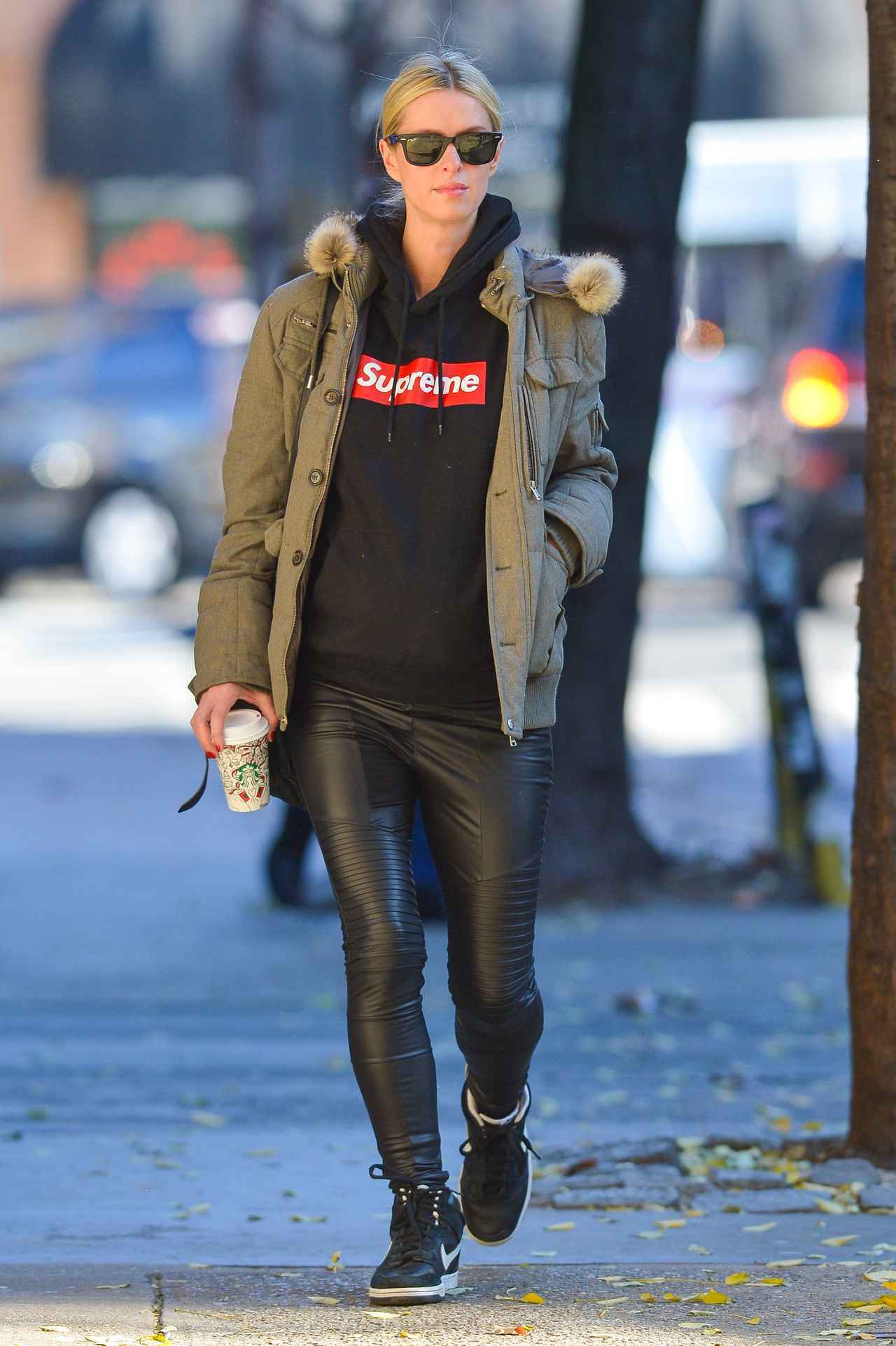 シュプリームのフーディーをアクセントにしたメンズライクなコーデで、スターバックスから出てきたニッキーをキャッチ。ボトムも黒で統一して、シュプリームロゴの赤をアクセントに。