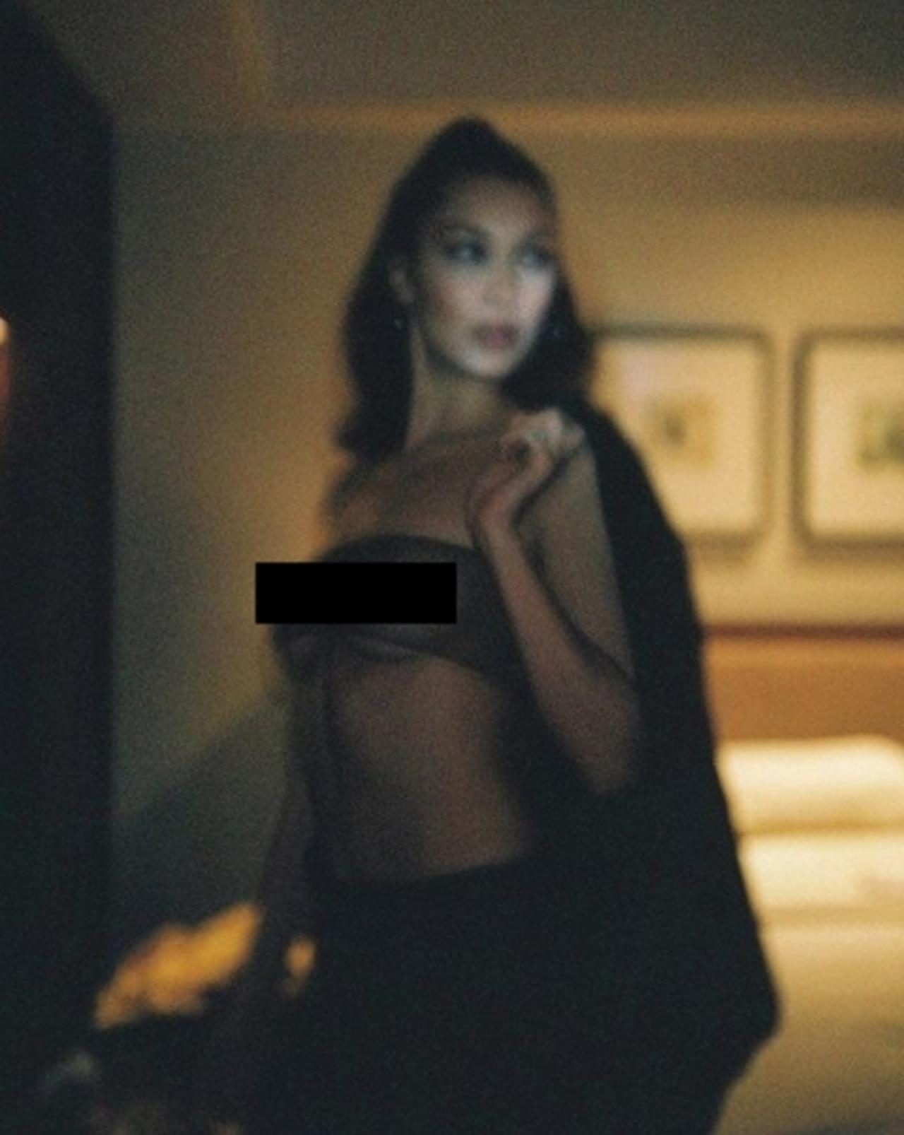 シースルーのチューブトップから胸が露わになっていたため、お見せした写真はこちらで修正を加えているが、ベラが公開したのはインスタグラムが原則的に投稿を禁止している「ヌード写真」にあたる画像であった。