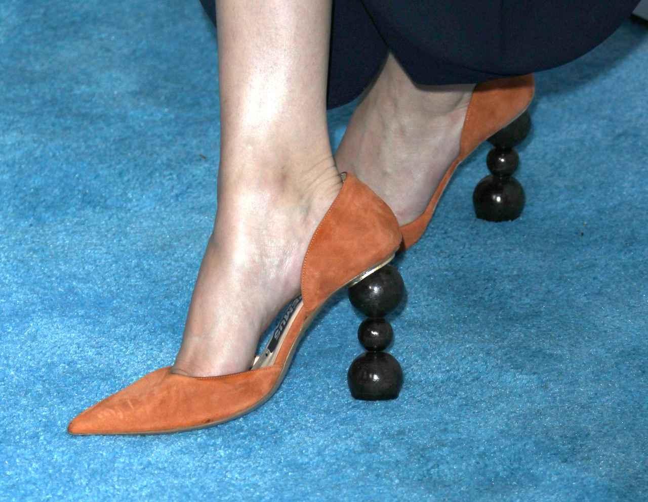 そこにセレーナが合わせたのは、同じくJACQUEMUSのシューズ。個性的なシューズを展開するJACQUEMUSらしく、大小の丸が3つ重なったヒールは新鮮を集めるデザイン。落ち着いたスエード生地のオレンジブラウンカラーで、スタイルにアクセントを与えた。
