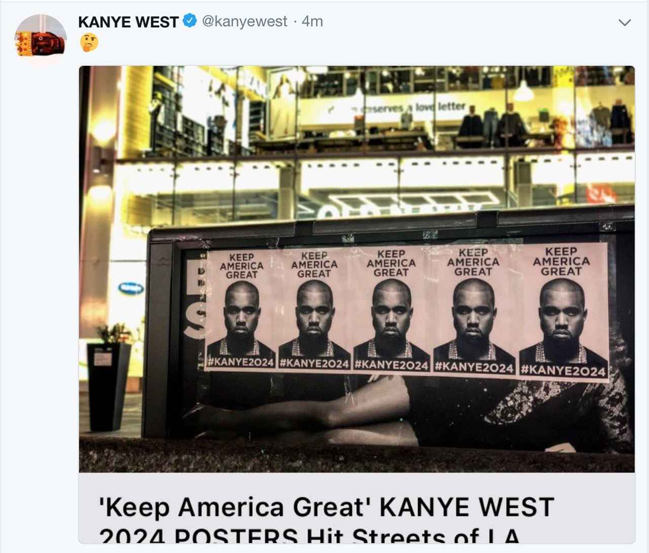 4月中旬から約11ヵ月ぶりにツイッターの更新を再開した人気ラッパーのカニエ・ウェスト(40)が、ある写真を投稿し、2024年の米大統領選に出馬する意欲を見せている。