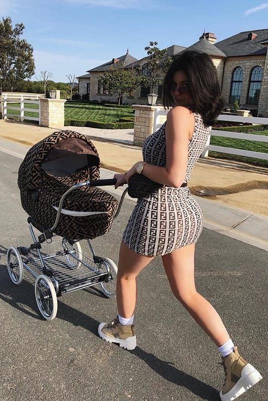 フェンディのベビーカーに乗せて子育て中のカイリー・ジェンナーは、ベルトポーチとワンピースもフェンディで統一したセレブママなスタイル。