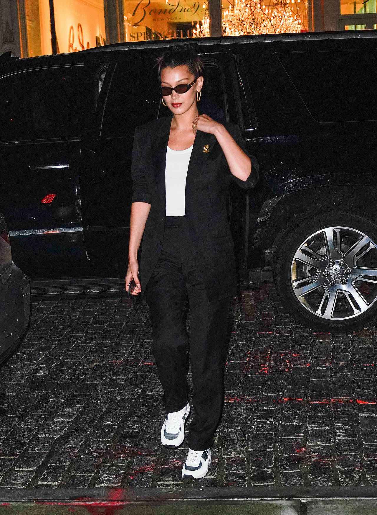 ジジよりもぐっとカジュアルにまとめた妹のベラ。端正でスマートな黒のスーツセットアップを、トレンドのダッドシューズで一気にアスレジャースタイルにシフト。インナーもシンプルなTシャツでおさえて。