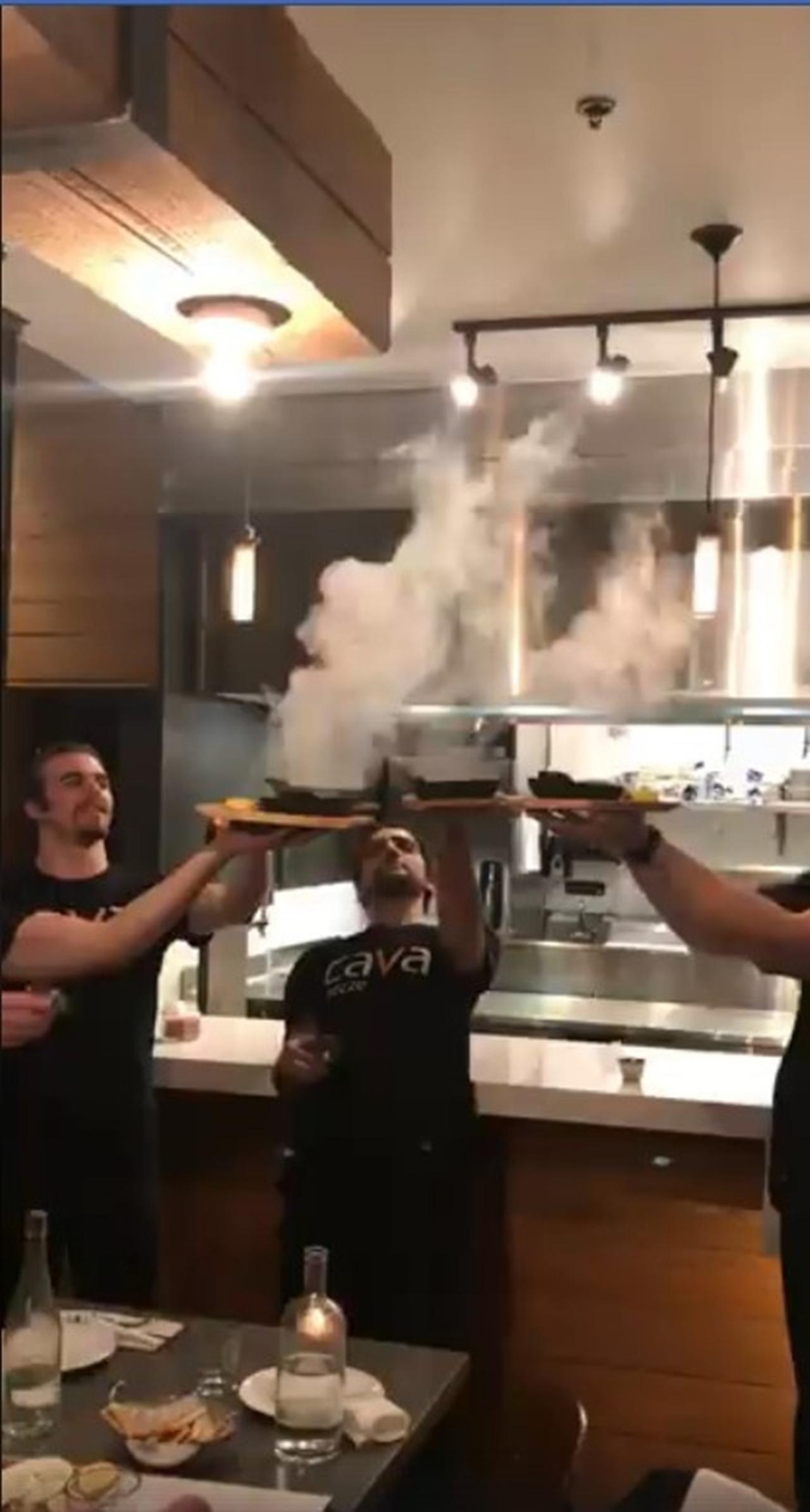 ある団体客がアメリカのギリシャレストランで、油と一緒にチーズを鉄板の上で焼くサガナキという料理を注文した。この店は、サガナキを注文すると鉄板の上に火を付けるパフォーマンスを見せてくれることでも有名。
