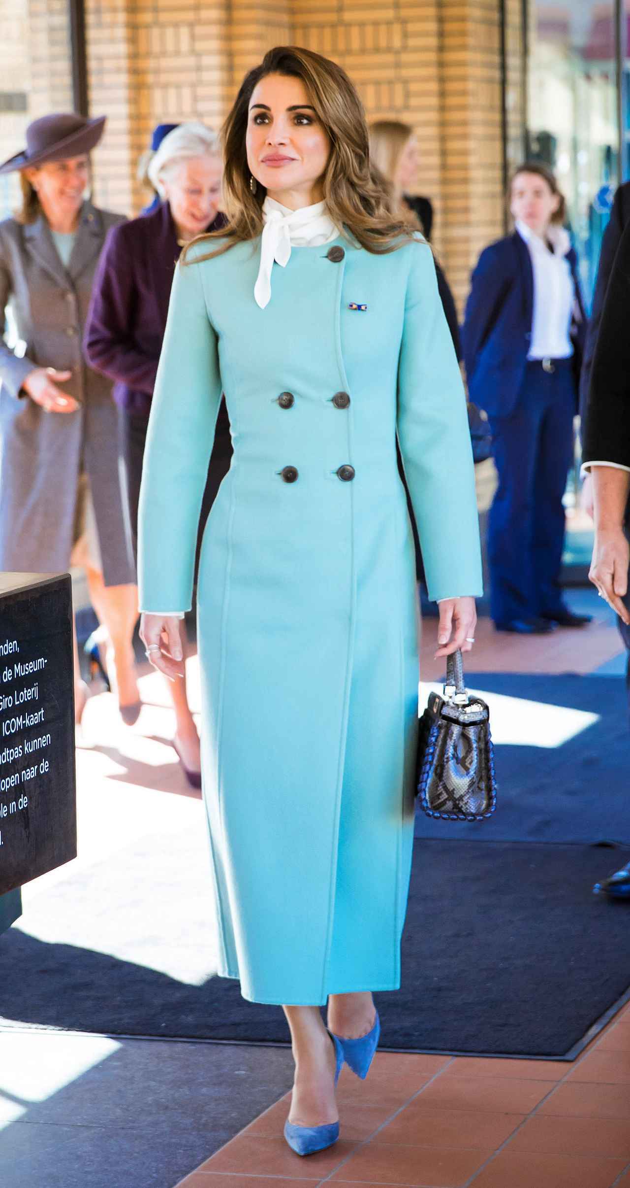 冬には、ダブルボタンのアイスブルーカラーのロングコートで現れたラーニア王妃。首元から白のスカーフをのぞかせて。パンプスもコートになじむようにブルーカラーをチョイス。バッグはFENDI。