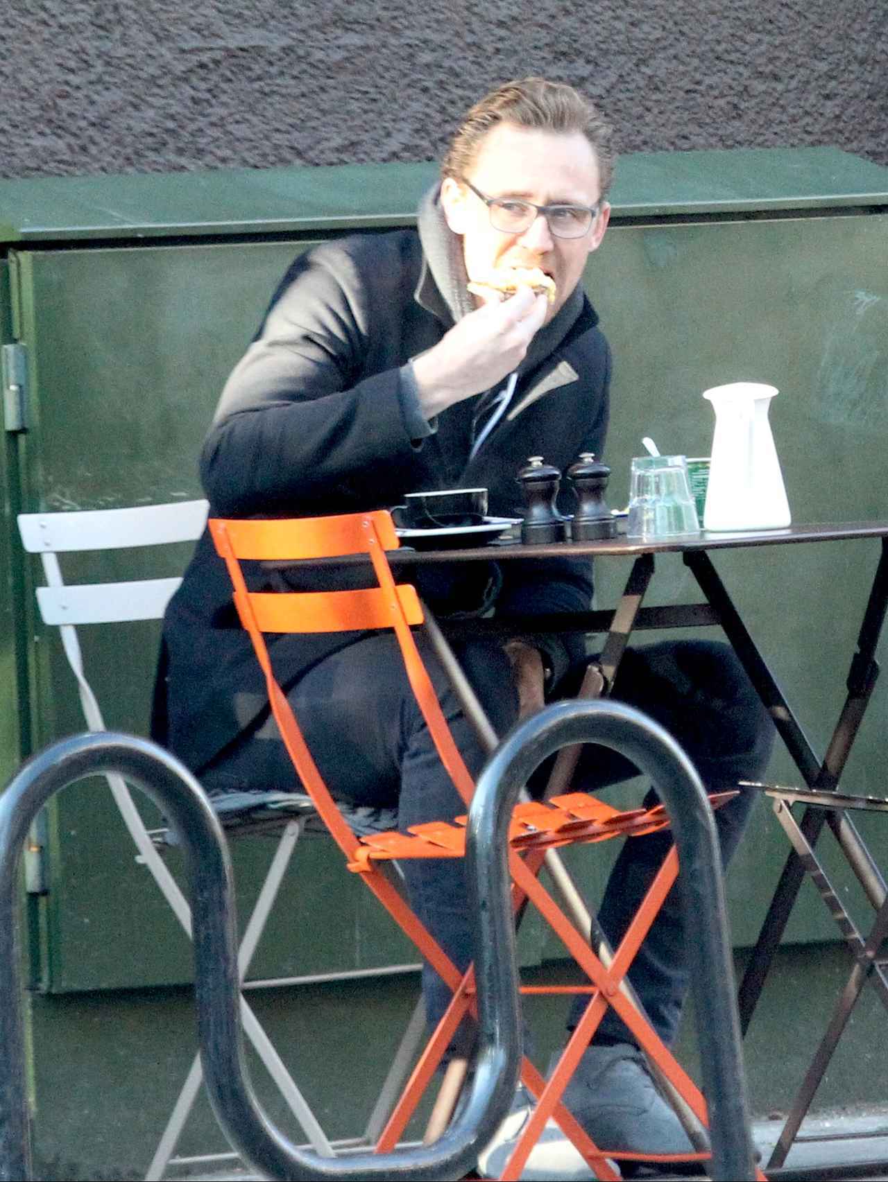 ロキ役のトムは、優雅な朝食をテラス席で楽しんだ。一流セレブでも一般人と並んでひとりの時間を満喫する姿に親近感。