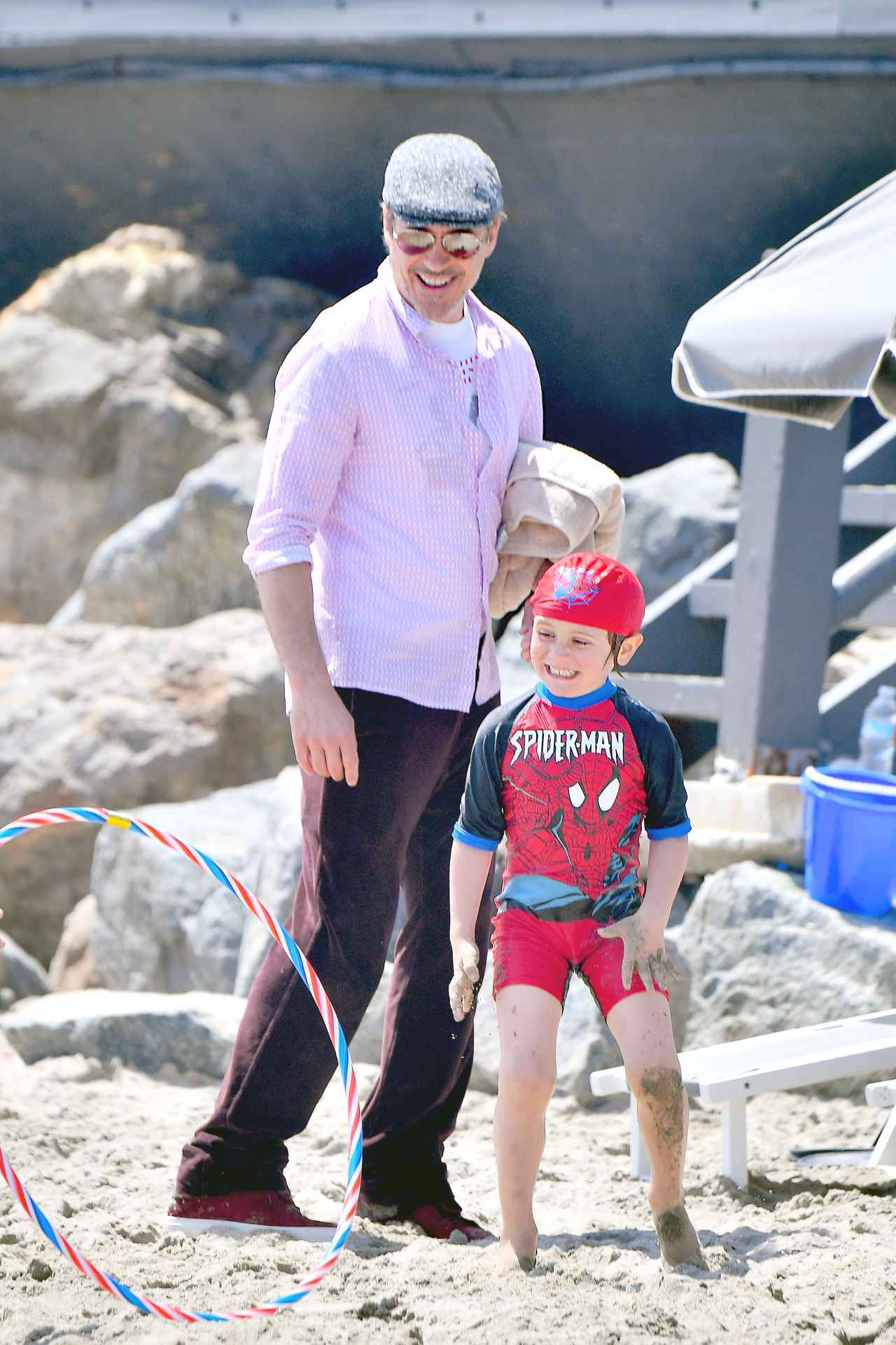息子のエクストン君がスパイダーマンの水着を着てはしゃいでいるのを見守るアイアンマン役のロバート。