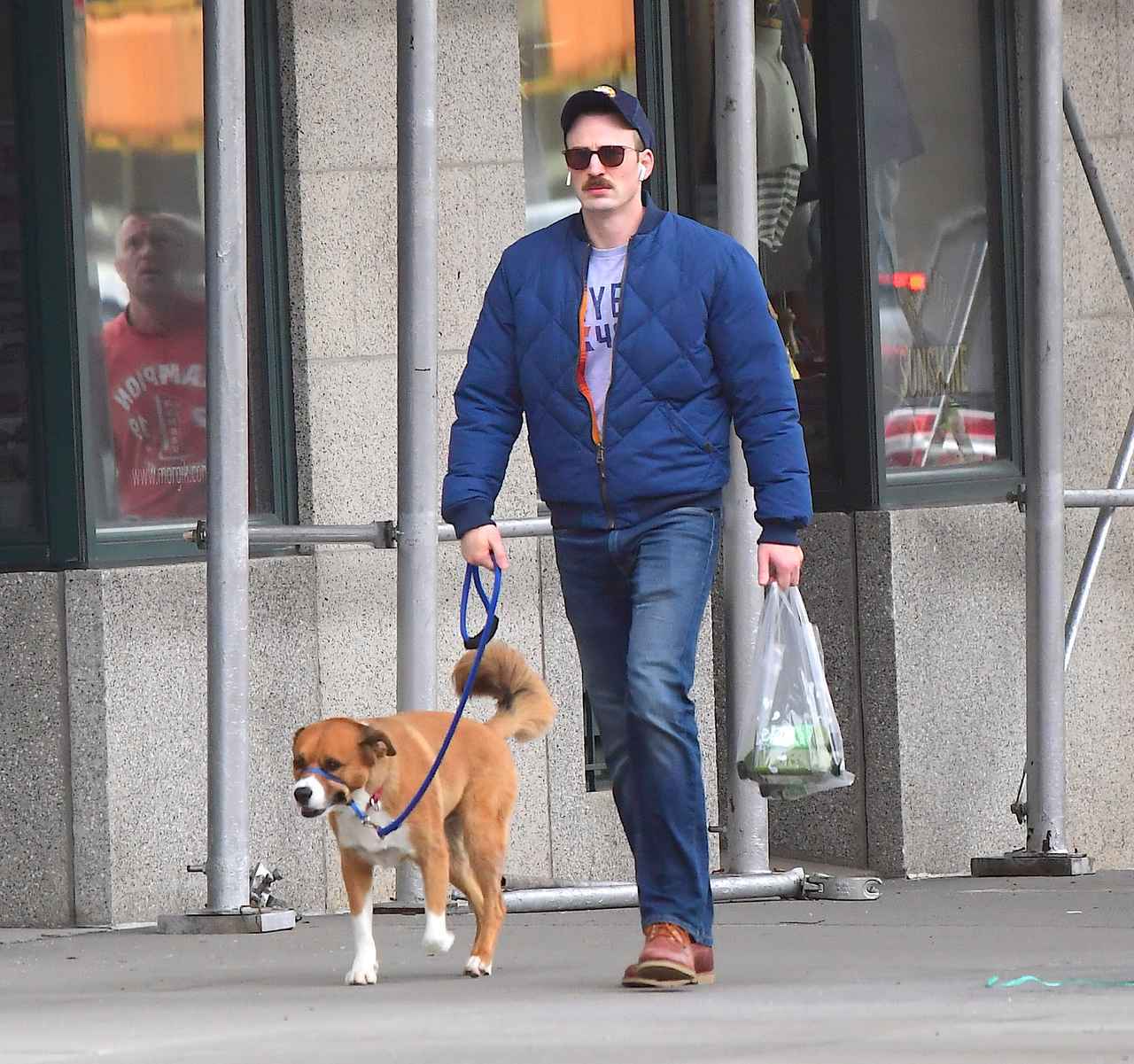 片手にリード、片手に買い物袋、そしてイヤホンを着けて散歩しているのは、キャプテン・アメリカ役を演じたクリス。ちなみに、なかなか主張の強いクリスの口ひげは役作りのため。