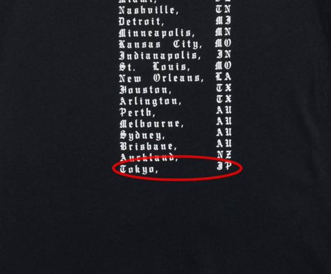 そのなかでもツアーTシャツといえばお決まりのアイテム。今回のこのアイテムには、ツアーで周る場所が書かれており、これまで公演が発表されてきた地名が並んでいる。