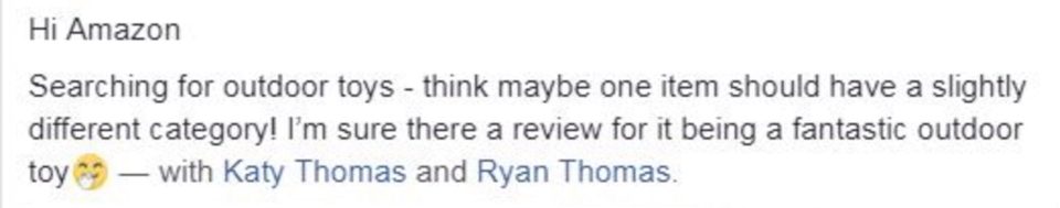 2歳の子を持つイギリス在住のジェニ・ドブソンという女性が、友人主催のガーデンパーティに出席するにあたり、その友人の息子に何かプレゼントを購入しようとアマゾンで「外用のおもちゃ(Outside Toys)」と検索したところ、オススメ商品のなかに彼女が求めていたものとはまったく違う商品が…。
