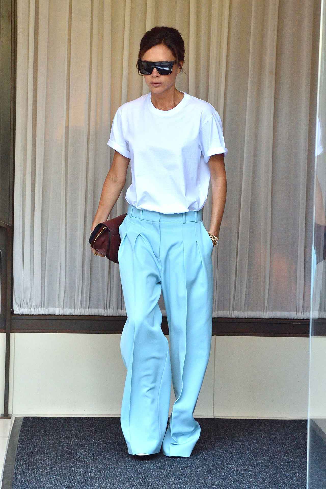 ゆったりめの白Tシャツを、さわやかなアイスブルーのワイドパンツにセットし、夏らしい涼しげなパンツスタイルを披露したヴィクトリア。自身のブランドVICTORIA BECKHAMのハンドバッグをクラッチバッグ持ちしてこなれ感をプラス。