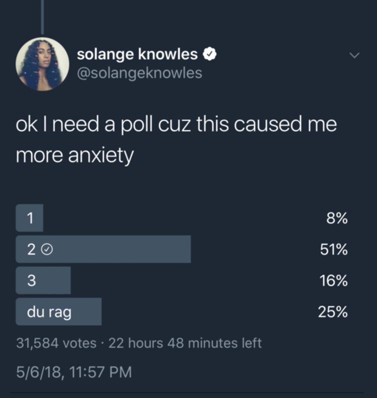 poll closed luh yall https://t.co/JIjYJHO6sL— solange knowles (@solangeknowles) 2018年5月7日