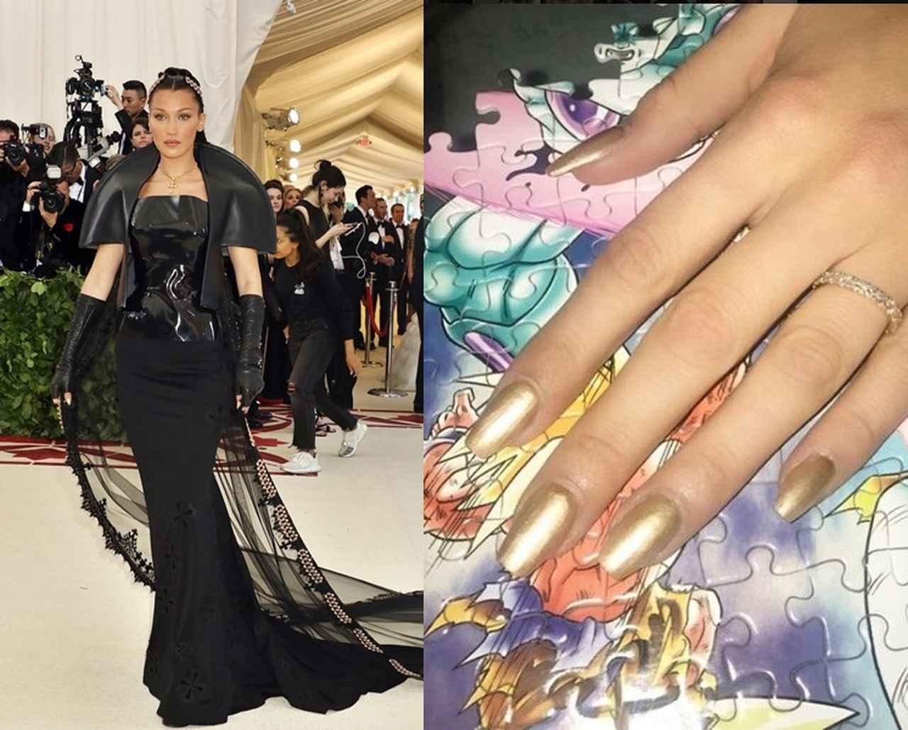 オールブラックでダークなドレススタイルで魅了したベラは、ネイルはメタリックゴールドをチョイス。シンプルながら、絶妙にブラックとマッチ。