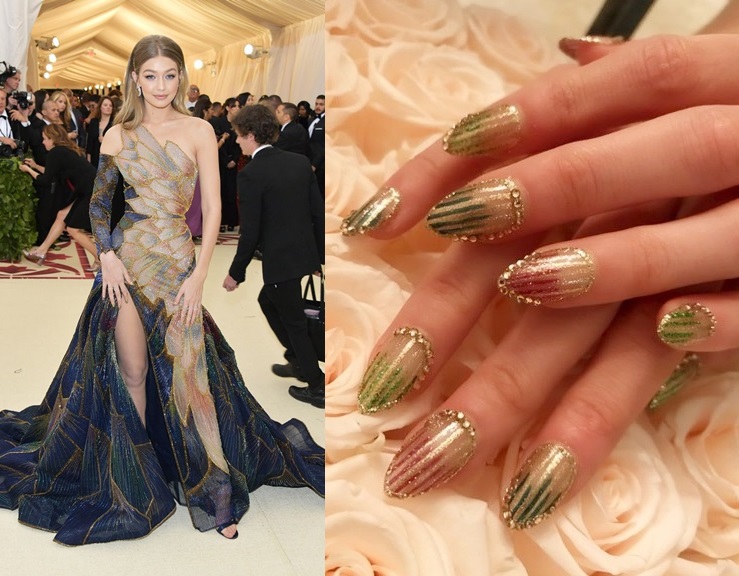 ジジはステンドグラスにインスパイアされたというVERSACEのドレスに合わせ、グリーンとレッドのストライプにゴールドが入ったデザイン。ゴールドのビジューで一部を囲むテクニックで一気にエッジーに。