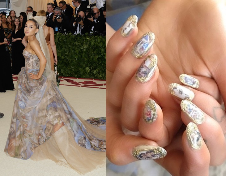 今年のテーマに合わせて、システィーナ礼拝堂にあるミケランジェロの「最後の審判」が描かれたドレスで登場したアリアナ。なんとよく見るとネイルにも「最後の審判」が!