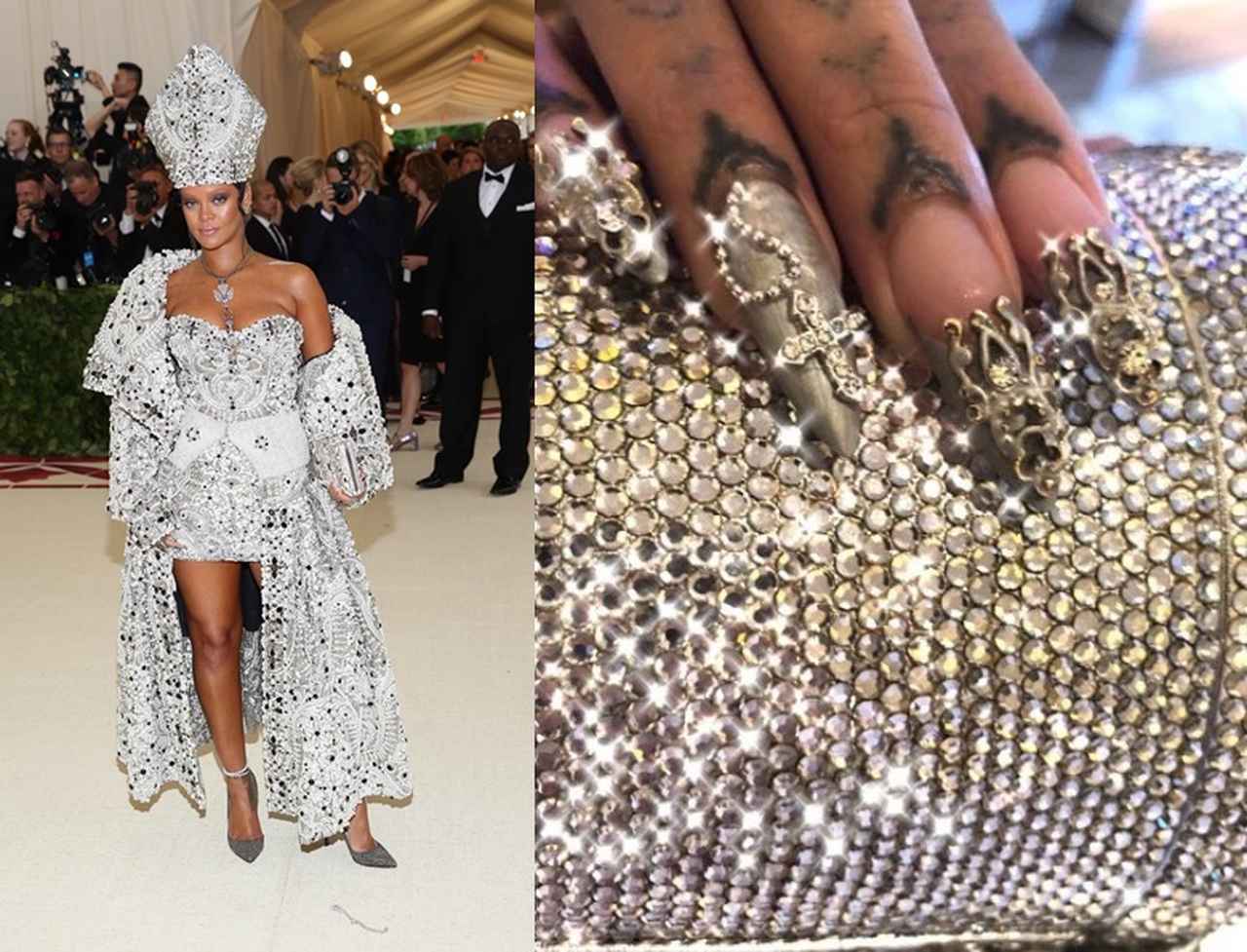 毎年テーマに合うように全力を注いで参戦し、今年は法王をイメージしたドレスで多くのメディアからベストドレスに選ばれたリアーナは、ネイルも気合い十分。十字架などのデザインがほどこされ、ドレスに負けない存在感を放っていた。