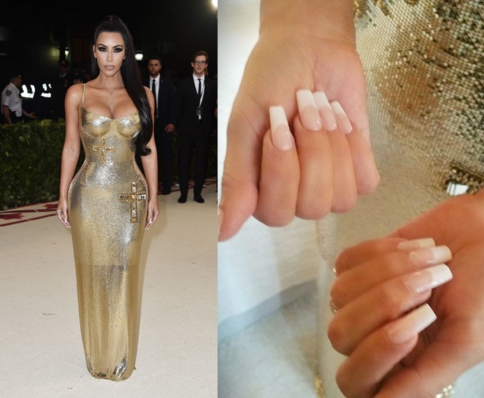 キムのボディを十分に引き立てるボディコンシャスなゴールドドレスには、シンプルなカスタムのフレンチネイルを。なんと友人のケイティ・ペリーがキムのために、このネイルチップをLAから飛行機で持ってきてくれたという。