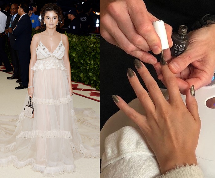 広告塔を務めるCOACHのシフォンドレスでレッドカーペットに登場したセレーナ。フェミニンなムード漂うドレスには、メタリックカラーのネイルでスパイスをプラス。