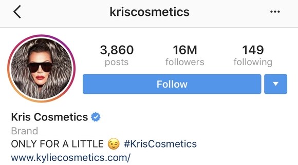 「カイリー・コスメティクス(Kylie Cosmetics)」のインスタグラムアカウントをのぞいてみると、名前が「クリス・コスメティクス(Kris Cosmetics)」に変わっていた。