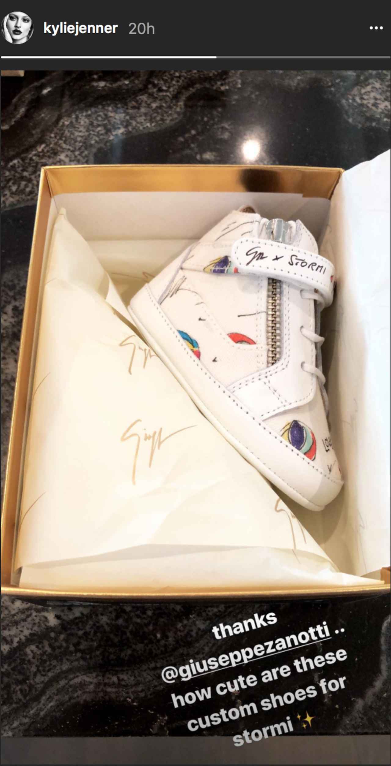 それはイタリアの高級ブランド、ジュゼッペ・ザノッティ(Giuseppe Zanotti)から届いたストーミちゃんへのプレゼント。セレブも愛用するブランドから3ヵ月の赤ちゃんにギフトが届くのもすごいけれど、ストーミちゃんの名前入りで、実はブランド側がストーミちゃんのためだけに作ったカスタムスニーカーだということが分かる。