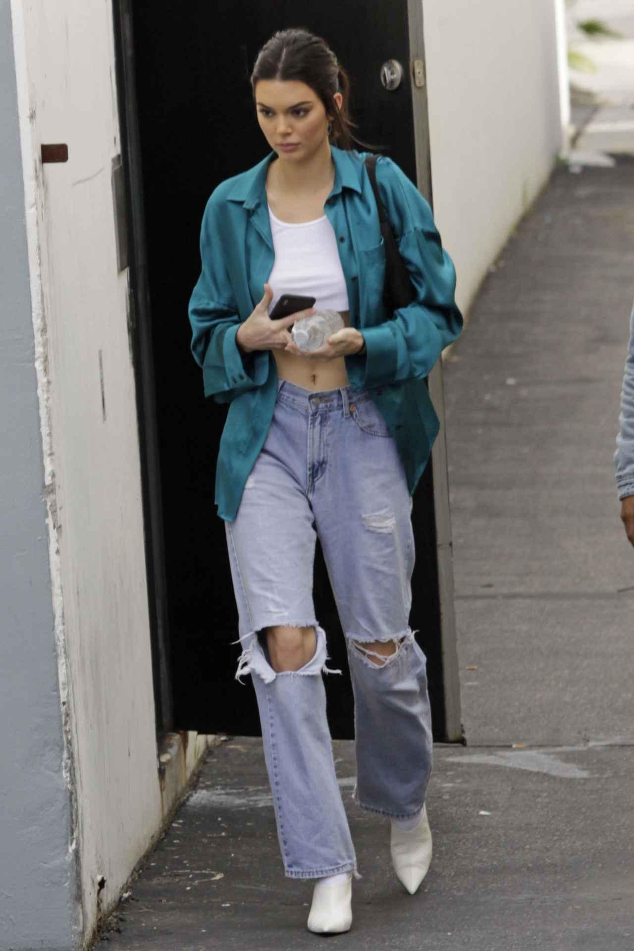 ストリート調のDanielle Guizioのダメージデニムを、Haider Ackermannのシルクシャツで艶やかなデニムスタイルにシフトしたケンダル。CÉLINEのポインテッドトゥミュールでシャープなエッセンスを。