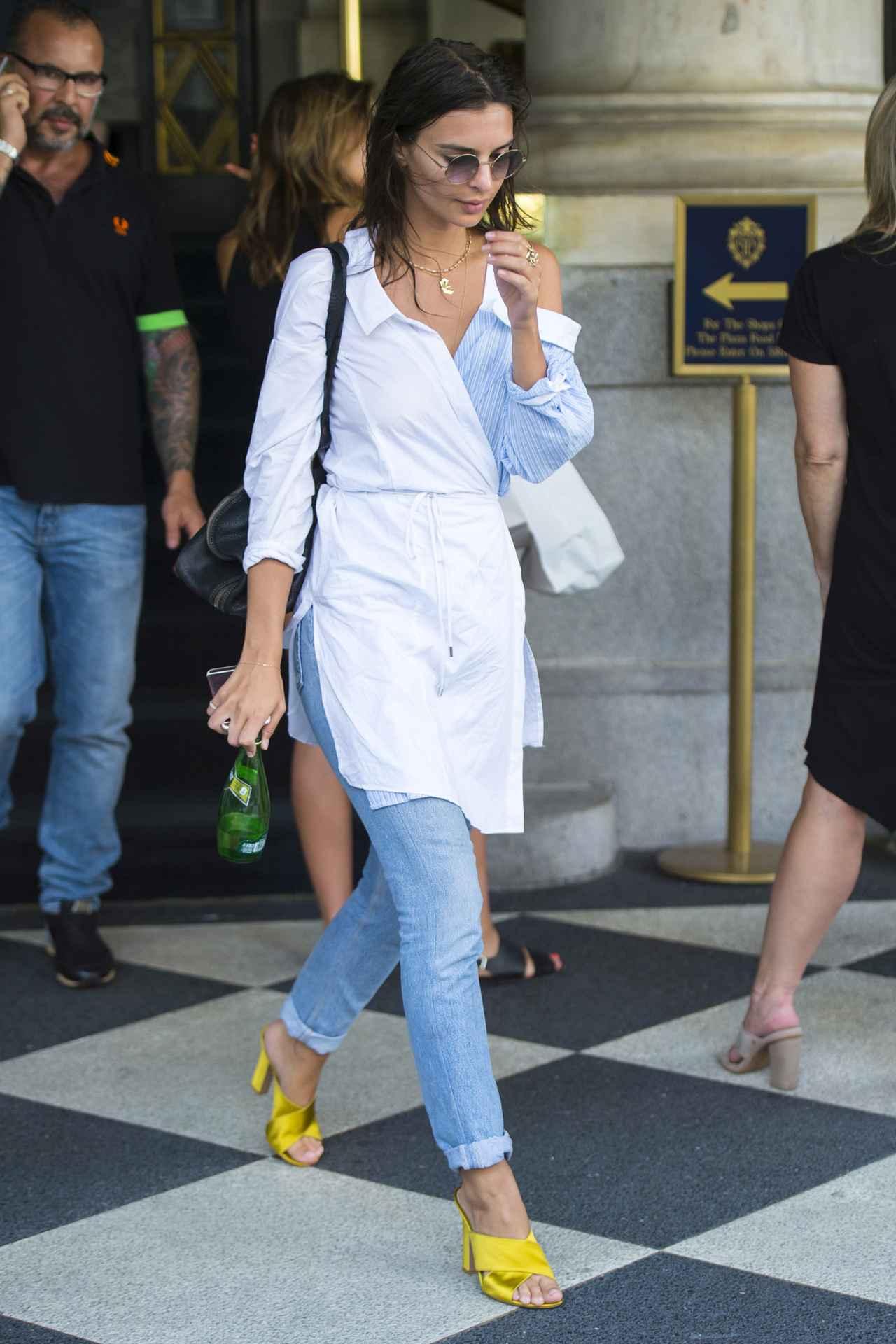 足元でリュクスなムードを漂わせるイエローのサテンミュールはGianvito Rossiのもの。ストライプ柄と無地柄が重なったZARAのシャツドレスとロールアップデニムでハイ&ローファッションの完成。