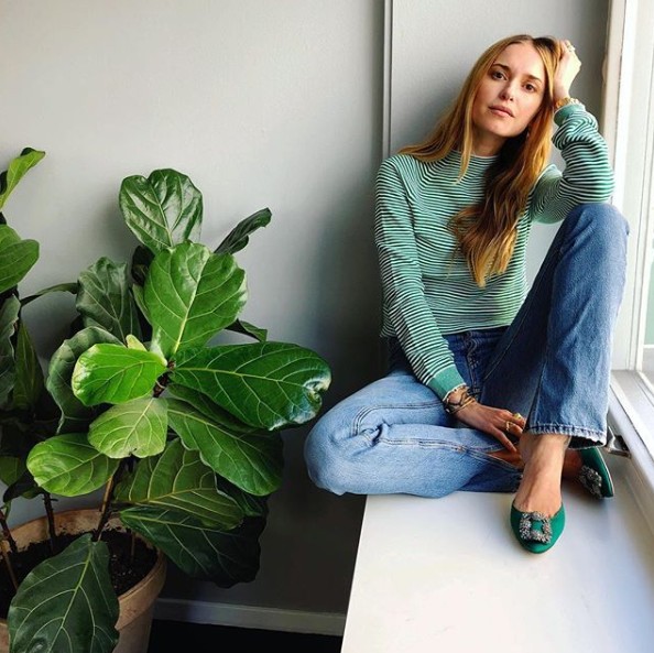 グリーンのボーダートップスとデニムを合わせたコーデには、Roger Vivierのグリーンカラーのミュールでカラーリンクさせて配色バランスを計算して。