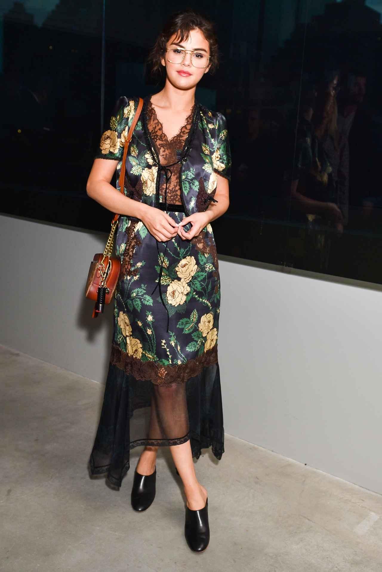 花柄とレースが印象的なCOACHのドレスを身にまとったセレーナは、足元はシンプルなTOD’Sのブラックミュールでドレスを引き立てて。