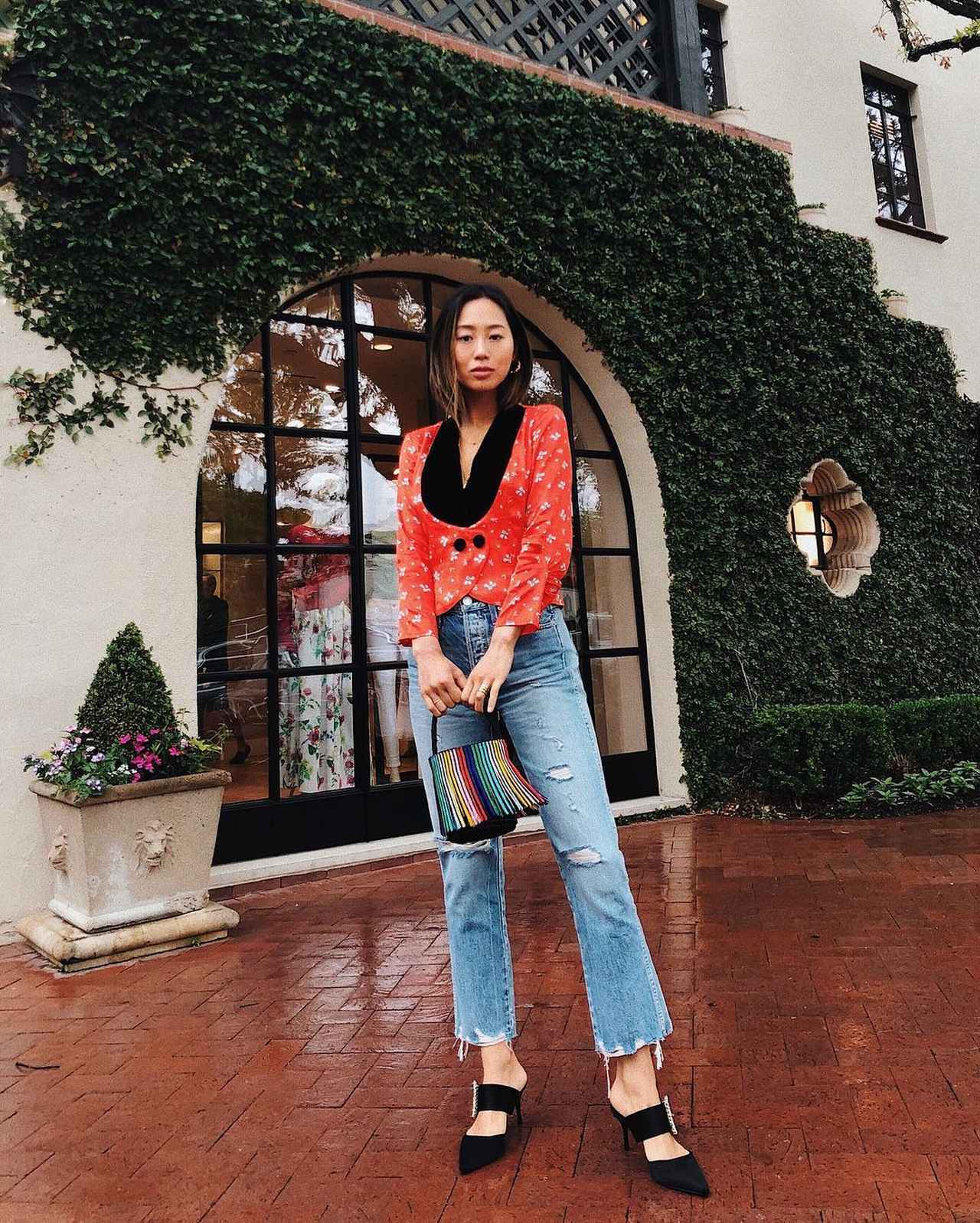 朱色の小花柄トップスをダメージデニムでカジュアルダウンし、Roger Vivierのアイコンであるスワロフスキーのバックル付きミュールでラグジュアリー感を演出。バッグはSensi。