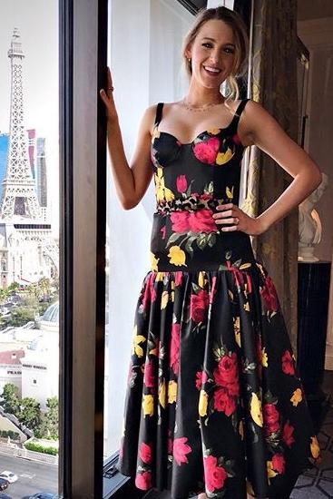 バスト部分がハートラインになったロマンティックなワンピは、レッド×イエローのフラワープリントが華やかな一着。