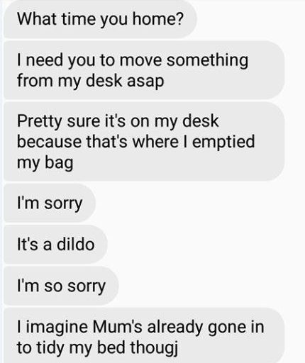 母親が自分の部屋に入って片付けをするのがわかっていたクリスの姉は、パニックになって彼にメール。恥を捨てて、正直に「ごめんなさい。大人のオモチャなの」とカミングアウトしたが、この日、クリスは予定があって家に早く帰ることができず、そうこうしてるあいだに“恐れていた事態”が起きてしまった。