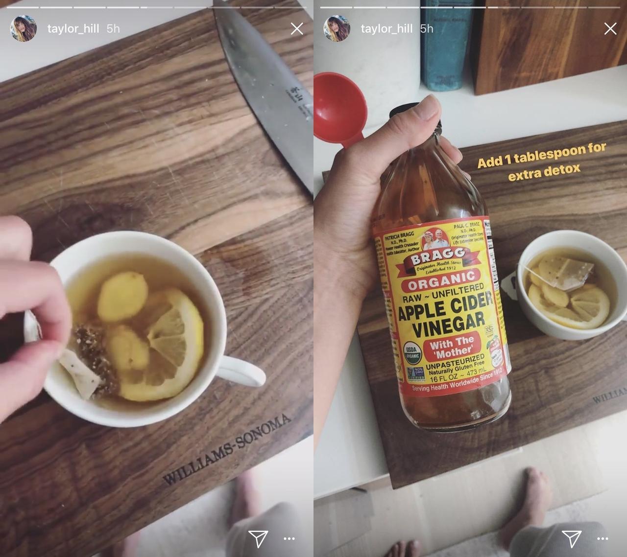 そこにテイラーは、さらにデトックス効果を高めるために、スプーン1杯分のアップルサイダーヴィネガーを加えた。