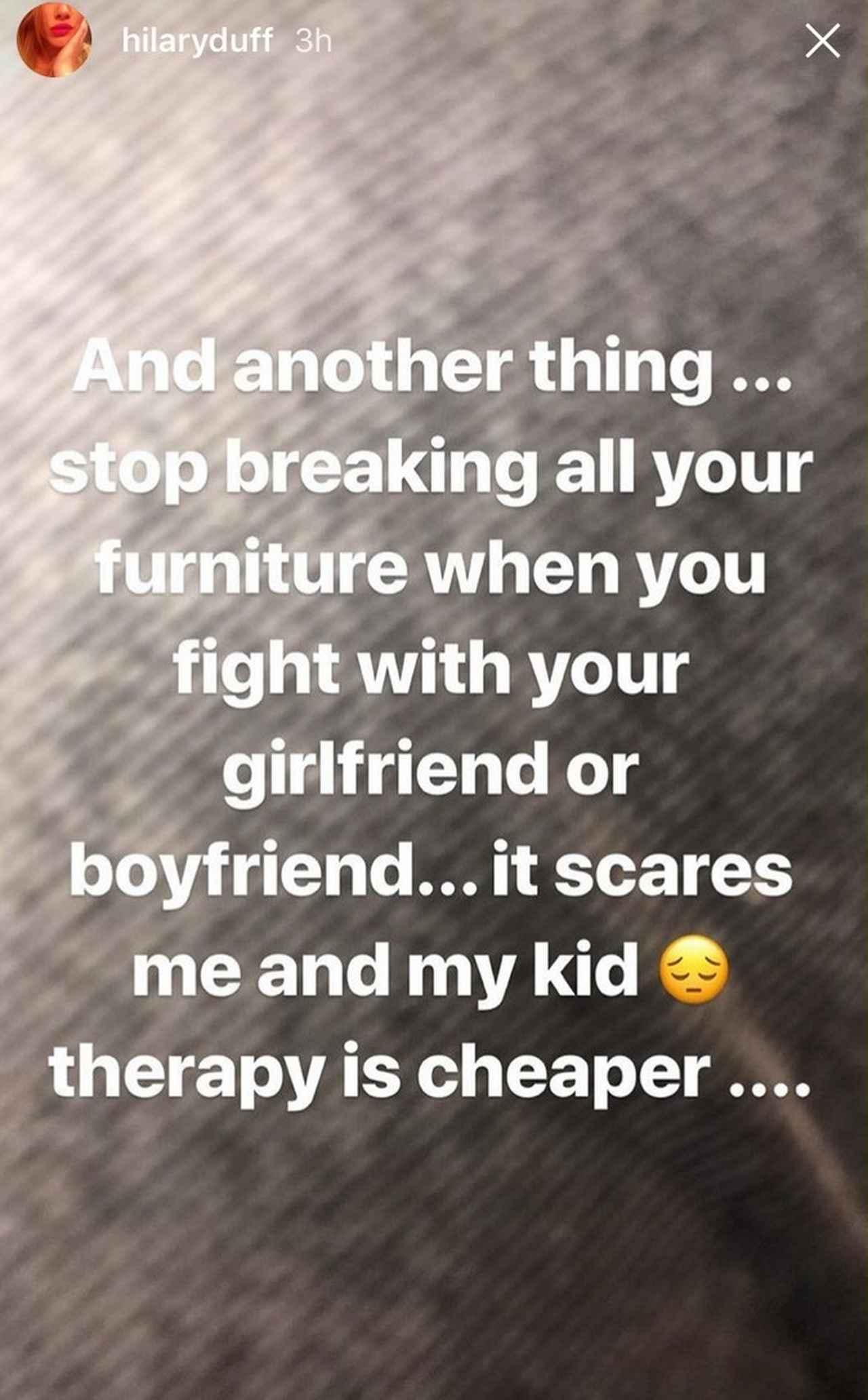 「もうひとつ…。彼女か彼氏とケンカする時に家具を壊さないでください。私と子供を怖がらせているわ。セラピーの方が安く済むのに…」と、悩まされていることが、タバコと大麻の臭いだけではないことも語ったヒラリー。
